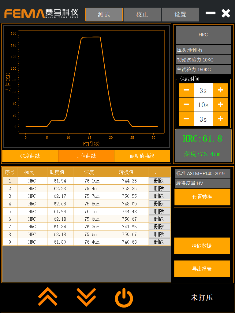 本系统采用上位机软件作为核心交互平台,相较于传统数显屏,实现了质的飞跃。它不仅提供更直观、友好的压痕测试控制体验,更能实时监控并记录整个打压过程中的力值与压深变化曲线。此外,软件还集成了测量数据的自动记录、硬度值计算与转换、以及一键生成专业报告等一站式功能,极大提升了测试的智能化水平和数据管理效率。