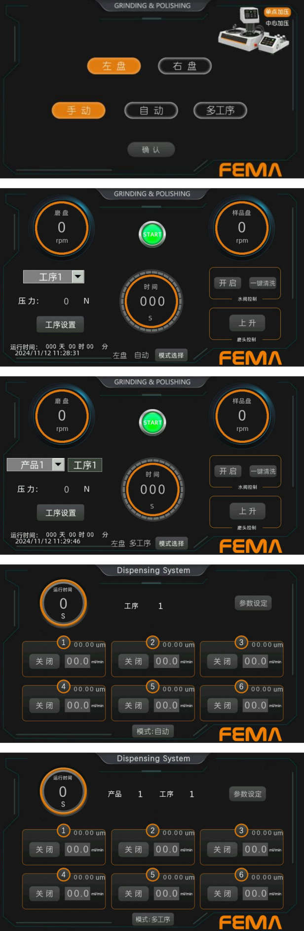 ◇ 多工序模式:可对样品进行命名,可对样品设置一整套研磨抛光流程,并能保存调 用整套流程。选择样品后,上一道流程结束, 自动进行下一道流程